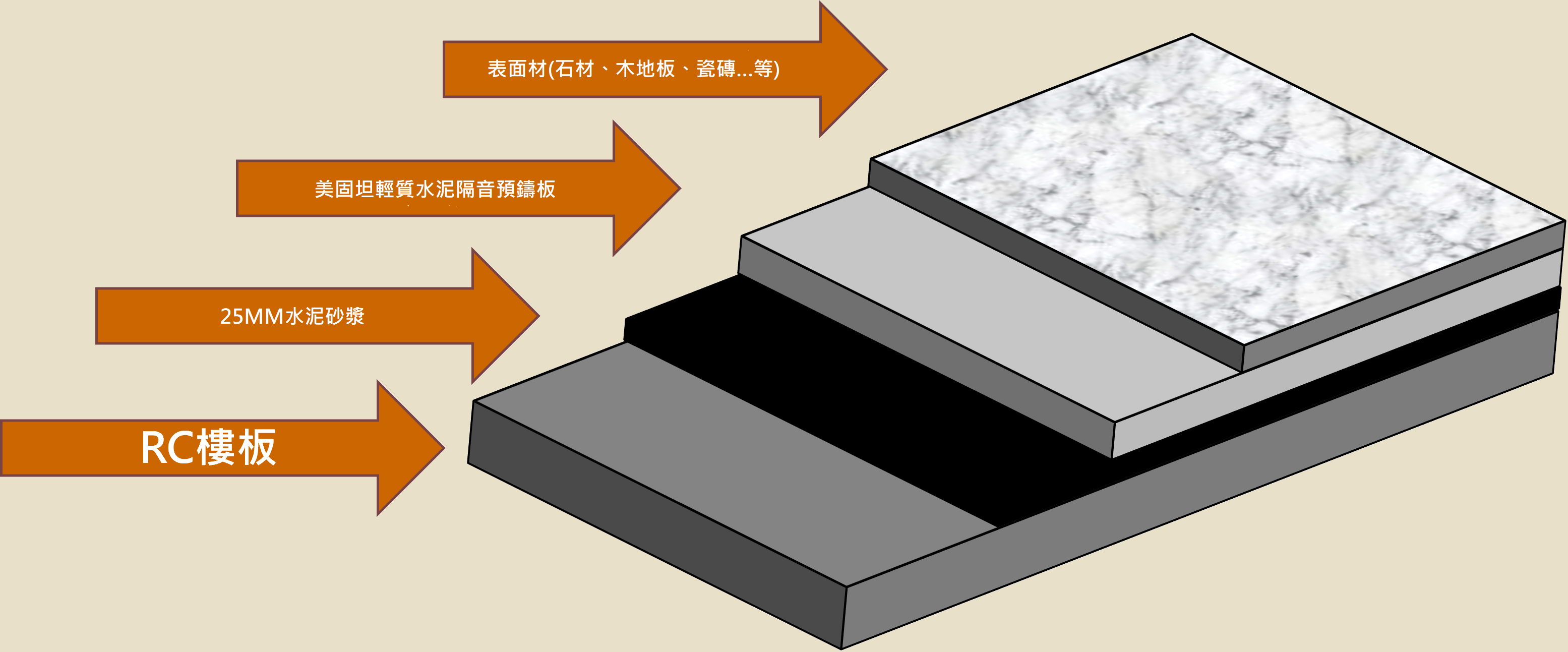 ■表面材不受限:屬永久性隔音層,施工後可鋪設木地板、地磚、SPC石塑等多樣台灣常見地板表面材
