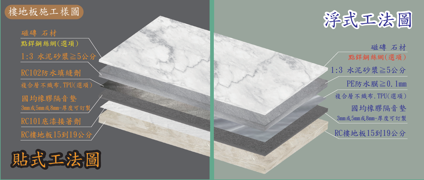 2021年1月1日新訂建築技術規則施工篇第46條之6規定新建分戶【樓地板的隔音構造】公告施行,此法為內政部促進「寧靜住宅」之理想,新法規第一款第七目及第二款規定,只要能降低17分貝或20分貝以上的表面材(含緩衝材)即符合,故近年交屋的新房絕大多數採用SPC地板或超耐磨仿木地板施作,而這樣的施作並非永久隔音層、耐久隔音層,若想要更換其他地板表面材,依法必須重做隔音層,若想一勞永逸,地板表面材不受限制就選最有感降噪的國均環保科技橡膠隔音墊🥳